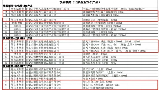 本次“名优特”农畜产品评定工作由企业线上申报,经评审专家依据《名优特农畜产品评价认定规范》团体标准进行现场打分、资质审验、实地考察、名单公示等环节的综合评定,最终确认53家企业的139个产品获得“名优特”认证。位于准格尔经济开发区的三家农副产品深加工企业的10个产品,经过层层筛选,在众多产品中脱颖而出,顺利入选“名优特”农蓄产品名录。其中包括内蒙古高原杏仁露有限公司生产的高原露玻璃瓶装235ml鲜榨杏仁露、高原露易拉罐装240ml杏仁露和塑料瓶装350ml杏醒杏皮茶;鄂尔多斯市王道酒业有限公司生产的盈天下酒40%vol诚盈(瓶装)500ml、248ml、125ml,盈天下酒42%vol乐盈(红、咖)(瓶装 盒装)500ml,盈天下酒42%vol礼盈(瓶装 盒装)500ml,盈天下酒53%vol礼盈(红色、蓝色)(瓶装 盒装)500ml;内蒙古蒙特农牧业发展有限公司生产的海红果白兰地(盒装)500ml、准格尔红(海棠酒)(盒装)750ml、准格尔红蒸馏酒(盒装)500ml。