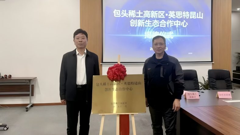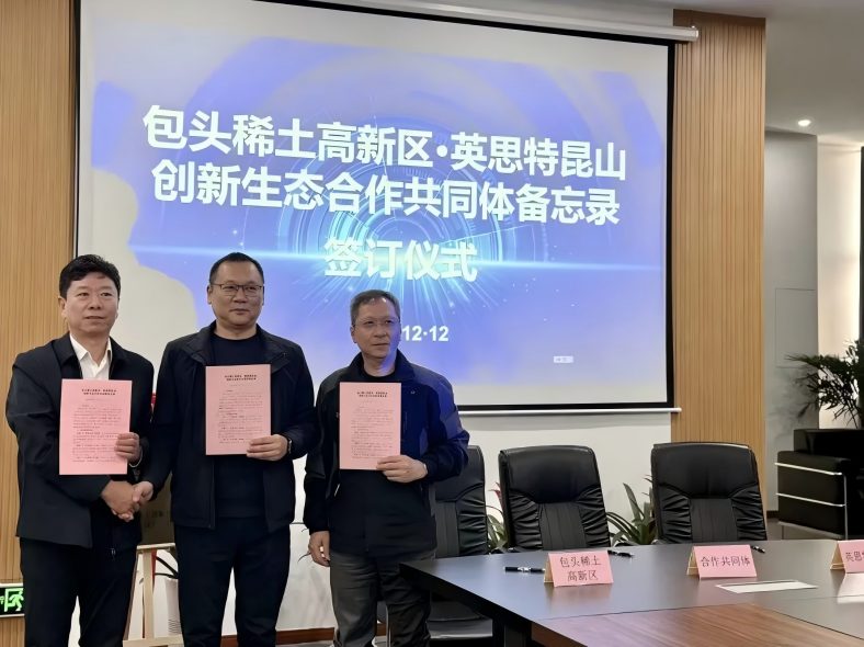 12日,合作接力棒传递至昆山。活动设置“稀磁聚势”“对话未来”“昆蒙链动”“携手共赢”四个篇章。现场,稀土高新区与包头市英思特稀磁新材料股份有限公司昆山分公司达成合作。双方共同与昆山嘉宝荣电子科技有限公司、昆山宝立荣电子科技有限公司签订《包头稀土高新区・英思特昆山创新生态合作共同体备忘录》,依托英思特公司“包头成长、昆山深耕”的优势,将构建“需求直通车”与“研发共同体”,以长三角市场的敏锐需求为导向,驱动包头稀土新材料迭代创新,推动产业链上下游共用“稀土科技创新链”,实现产业深度融合。